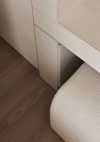 The design emphasises clean lines, soft neutral tones, and subtle curves, balanced with natural wood and textured elements to bring a sense of warmth and comfort.